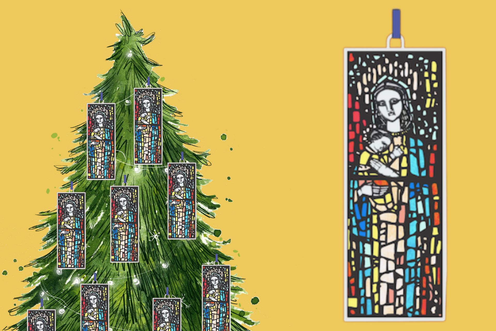 These beautiful ornaments feature Mary with Jesus depicted in the MGC stained glass windows.